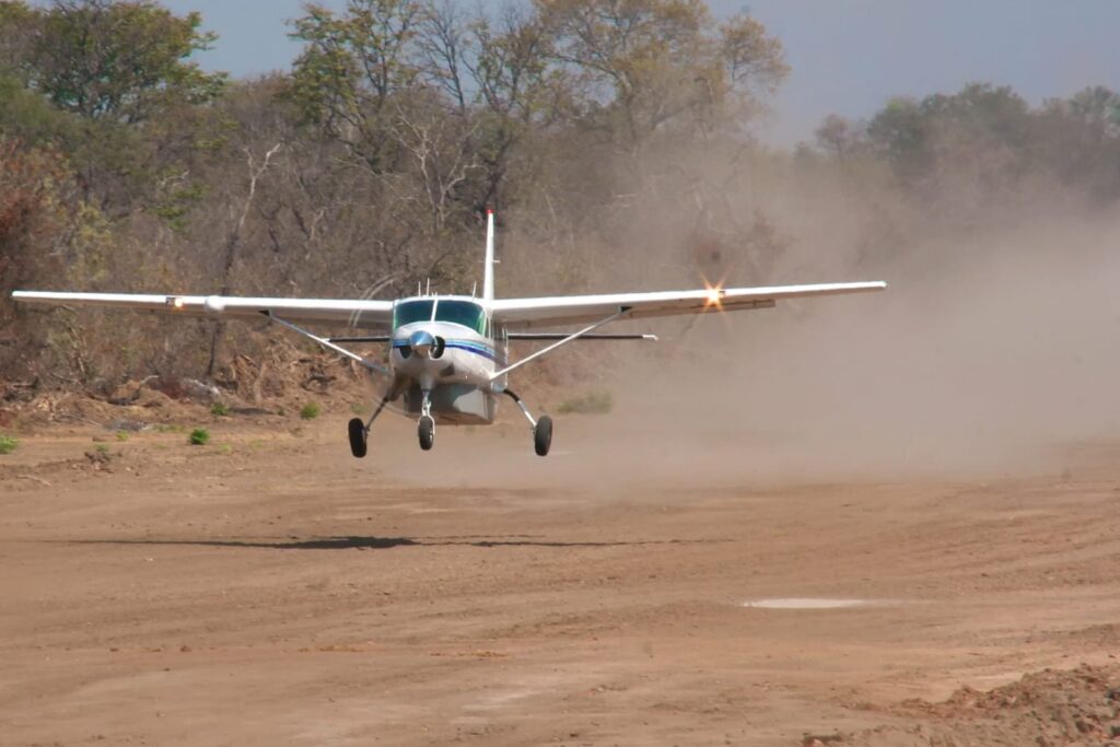 Cuando el brigadier con la avioneta pasa la lomada verde, ve a lo lejos el caserío del pueblo. Planea controlando el descenso y Hugo deja caer la nave sobre la pista de tierra. Al aterrizar, la nave hace piruetas sobre la cancha de aviación. La rueda derecha se hunde en el suelo a la altura de la vizcachera y da vueltas en círculos levantando una gran polvareda. En los virajes, se torció uno de los brazos de la avioneta.